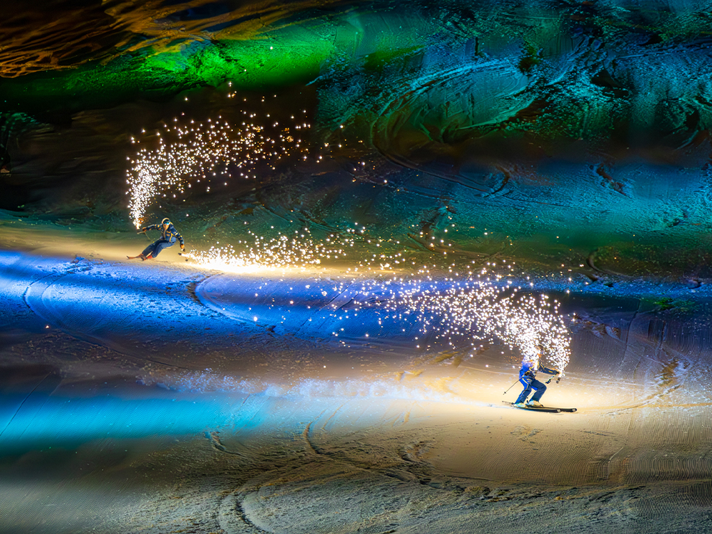 In the "Karl-Schranz-Zielstadion", visitors will experience a multi-media time travel show with visual effects through the history of skiing. The topic of the show is the development of skiing and technology over the course of the decades.